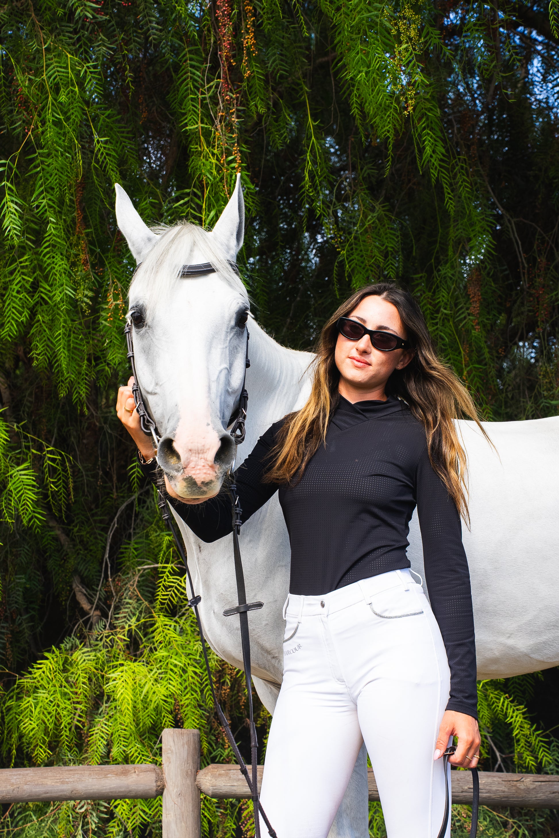 Stay cool and comfortable in the saddle with this lightweight, breathable riding shirt. Designed with a flattering V-neck and perforated fabric for maximum airflow, it offers performance, style, and all-day comfort for every ride.